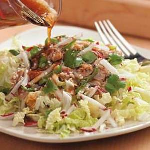 Пекинку порезать произвольно, лук полукольцами,добавить тунца вместе с соком, перемешать! Можно сложить все в лоток и потрясти! Выложить на блюдо и уложить четвертинки яиц! Сверху посыпать перцем! Вуаля!