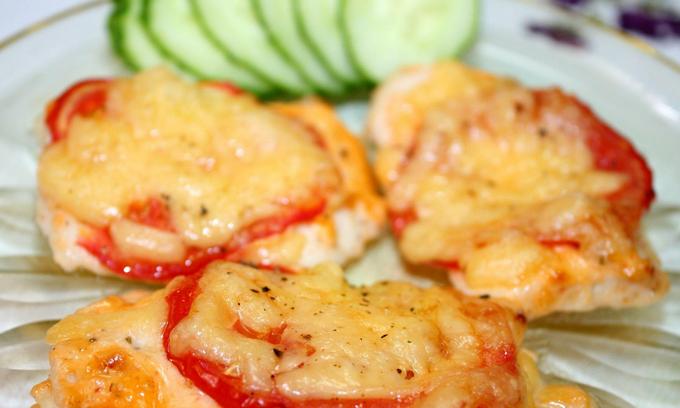 5. Филе выложила на противень, в надрезы вставила кружочки помидоров и присыпала сыром.
